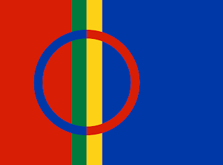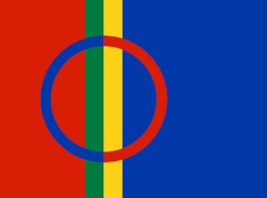 The Sámi flag above is one of the two official flags of Norway. Sámi people have established a strong political presence in Norway which now recognizes this Sámi flag as one of the country’s two official flags. They are flown together on state occasions, the Sámi flag beneath the Norwegian one. Designed by Astrid Båhl, the red part of the circle symbolises the sun, the blue part the moon. The colours red, blue, green and yellow reflect the Sámi national costume. Green symbolises nature, blue water, red fire and yellow the sun. The Sámi call themselves “The people of the sun”.